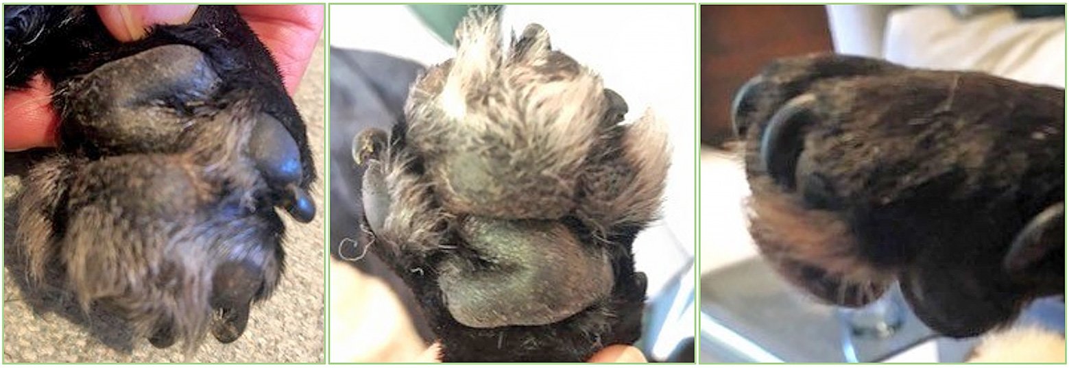 False pads can also result in ‘interdigital cysts’ and can be seen in dogs where abnormal conformation (shape of dog’s legs) results in altered weight bearing on hairy interdigital skin of the paw. Over time, and this can be years, because of the resulting chronic inflammatory changes, the foot tries to form new footpads at the sites; many dogs develop interdigital ‘cysts’ above these areas in the webbing of the pads.